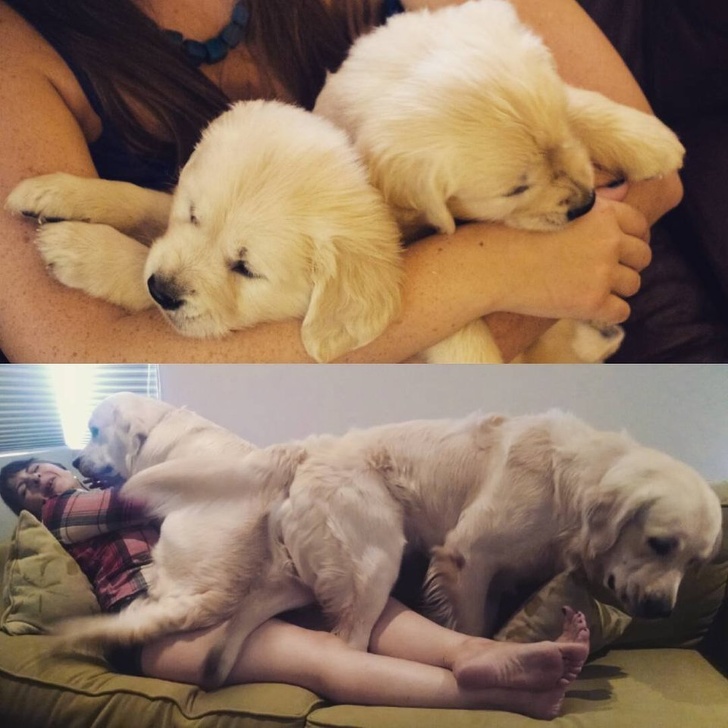 Los cachorritos crecen demasiado rápido. Un día están dormidos en tus brazos y al otro te despiertas con que se ha convertido en un oso que ocupa dos tercios de tu cama. Pueden volverse mayores, ¡pero nunca dejarán de ser lindos y tiernos!